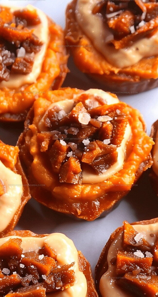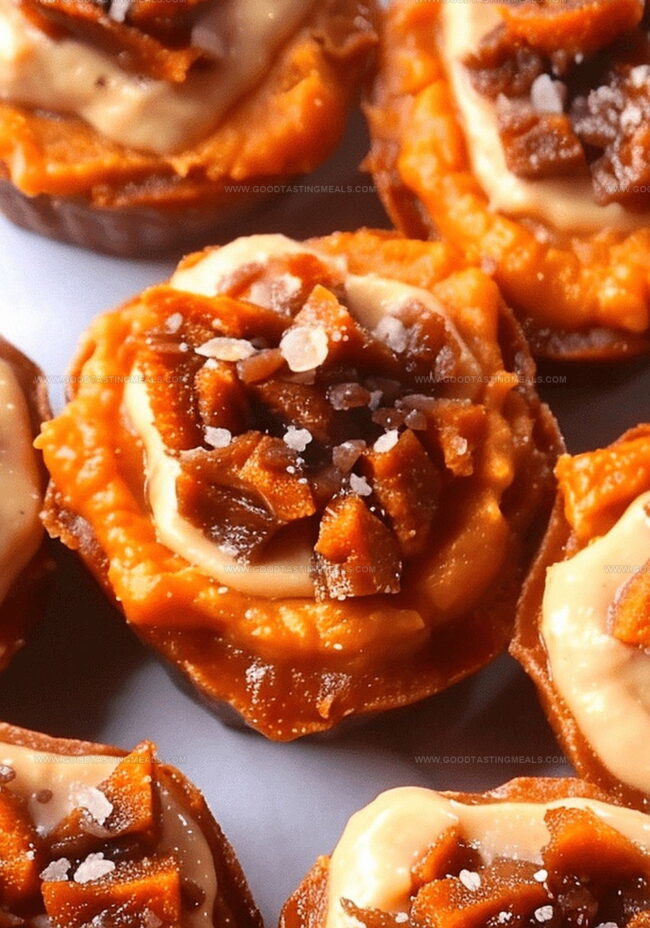 Note: These delightful bites combine the warmth of roasted sweet potatoes, creamy cheese topping, and crunchy candied pecans for an irresistible dessert experience.