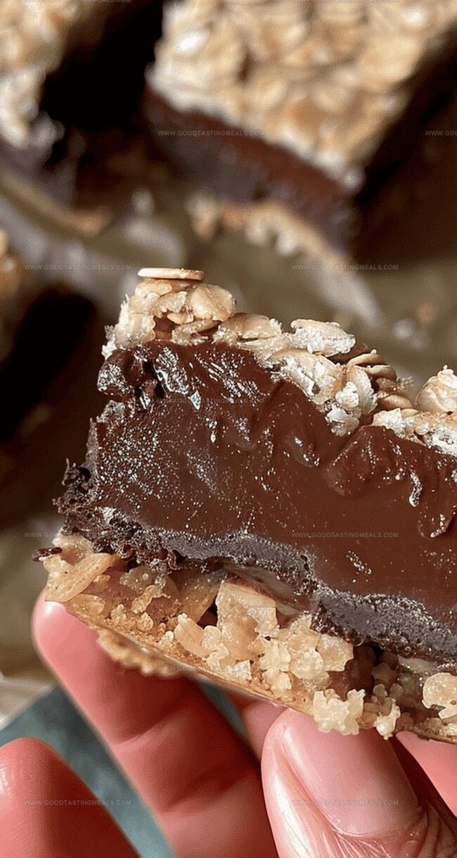 - Crumble the remaining oat mixture across the fudge layer, gently pressing to create a rustic, textured topping.