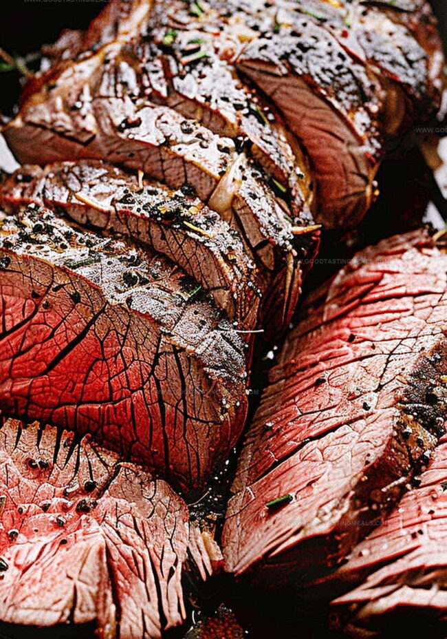 Presentation: Carve into elegant half-inch thick slices, revealing perfectly roasted, succulent beef tenderloin ready for sophisticated dining experience.