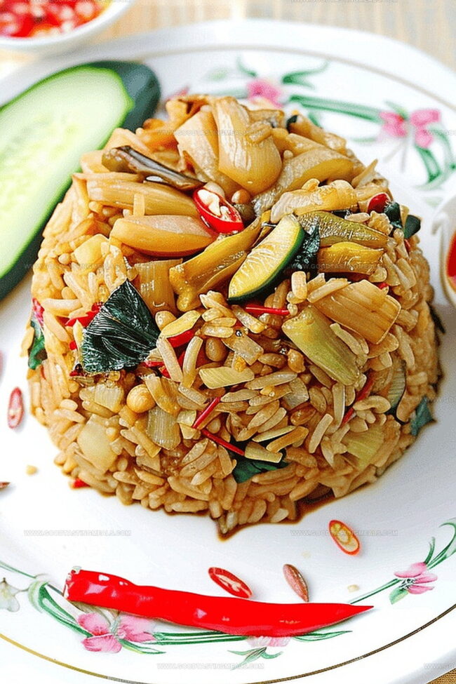 - Transfer fried rice into serving dishes, strategically placing reserved chili slices for visual appeal. Accompany with cucumber slices and optional fish sauce with chopped chilies.