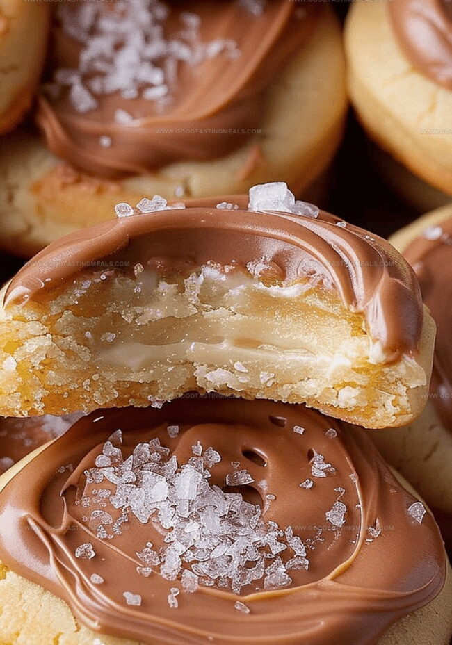 - Generously coat the caramel-topped cookies with melted chocolate, ensuring complete coverage.