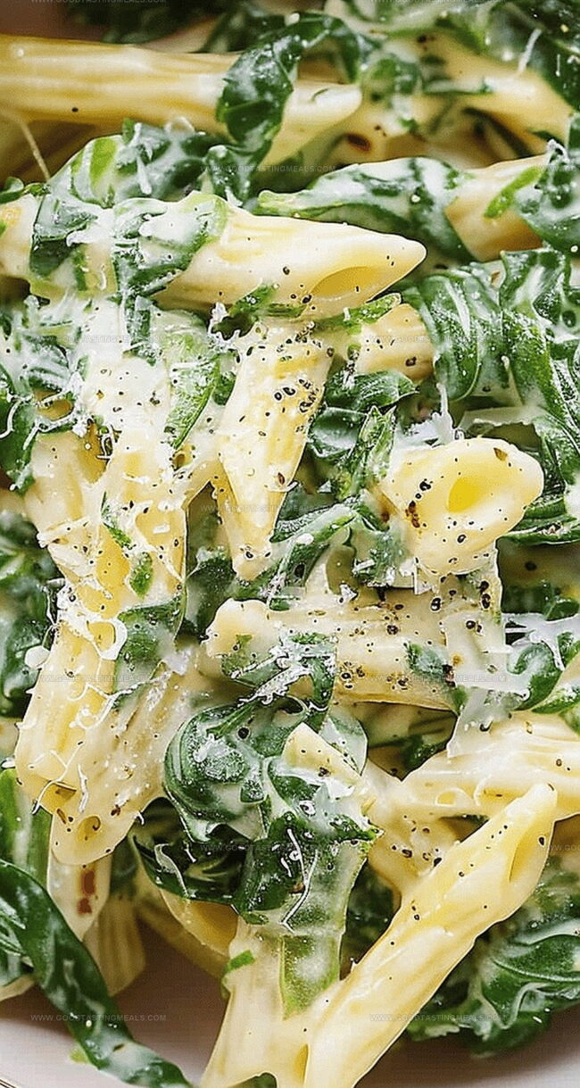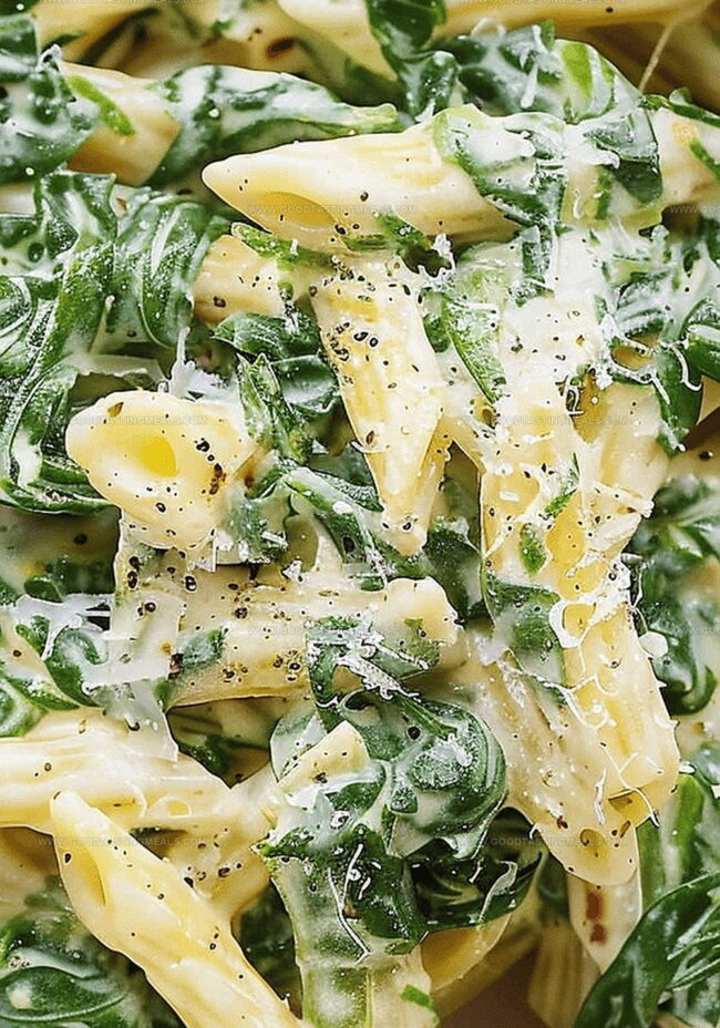 Fresh spinach blends seamlessly into a creamy, luscious sauce that coats each pasta strand with rich, verdant flavor.