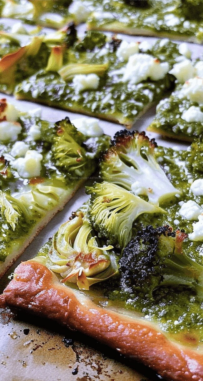 Crisp broccoli florets and tangy feta cheese nestle atop a golden crust, creating a harmonious blend of textures and tastes.