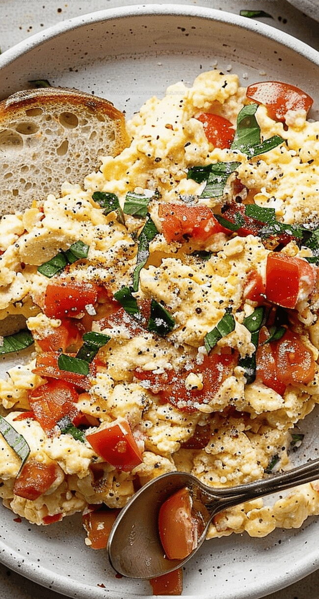 Greek-inspired mediterranean scrambled eggs blend fresh herbs, feta cheese, and ripe tomatoes into a quick breakfast masterpiece. Mediterranean flavors dance across the plate, inviting you to savor each delightful bite.