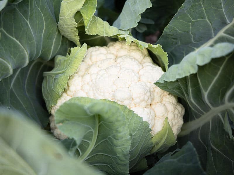 White cauliflower is the most typical species that you may think of when it comes to cauliflower. It has white heads of flower buds and green leaves around. It tastes stronger than other types and is most versatile in the cauliflower species.